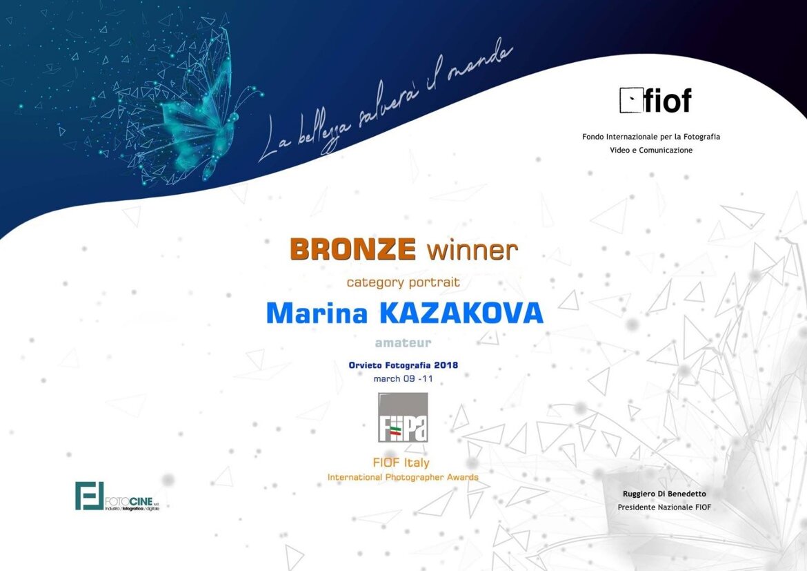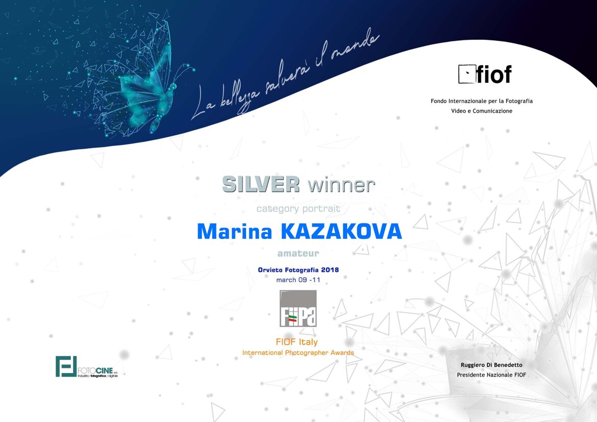 2nd place, 3d place, Honorable Mention (portrait category) Fondo internazionale per la Fotografia Italia FIIPA Awards 2018;