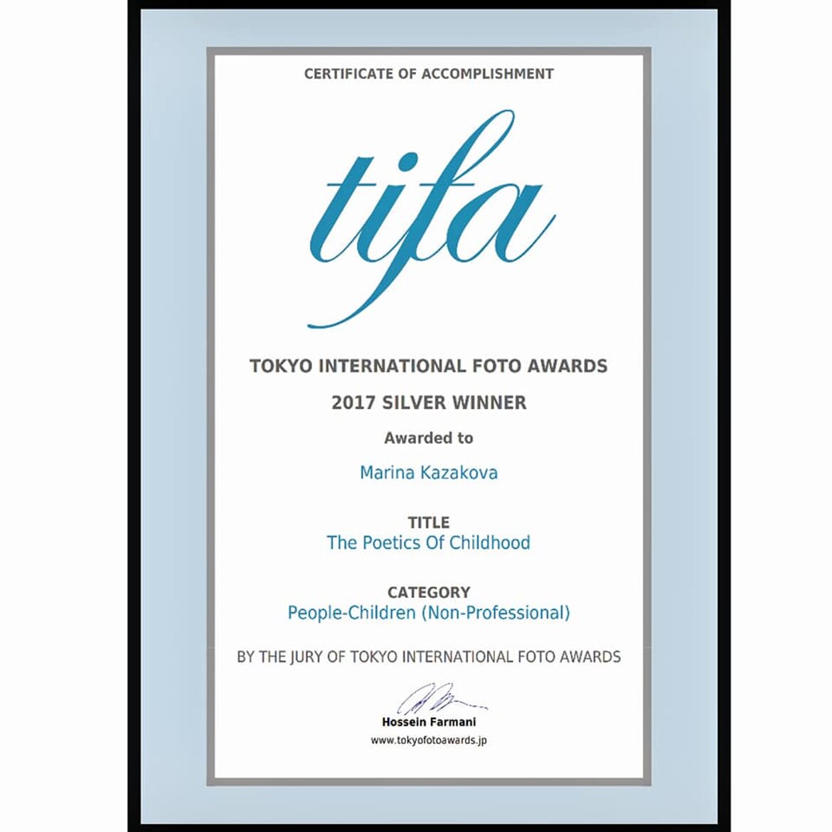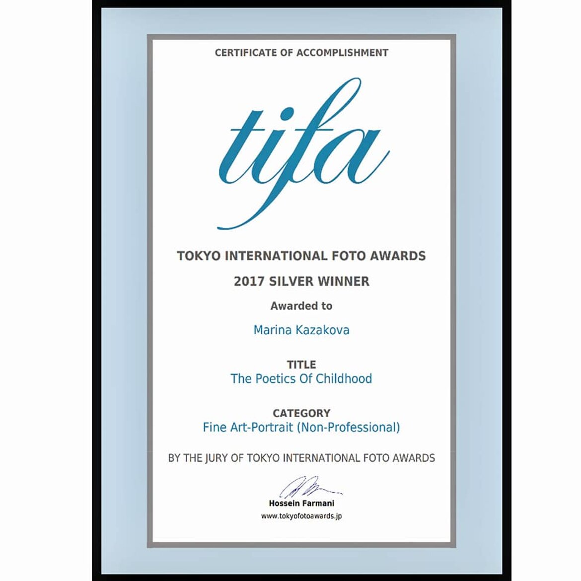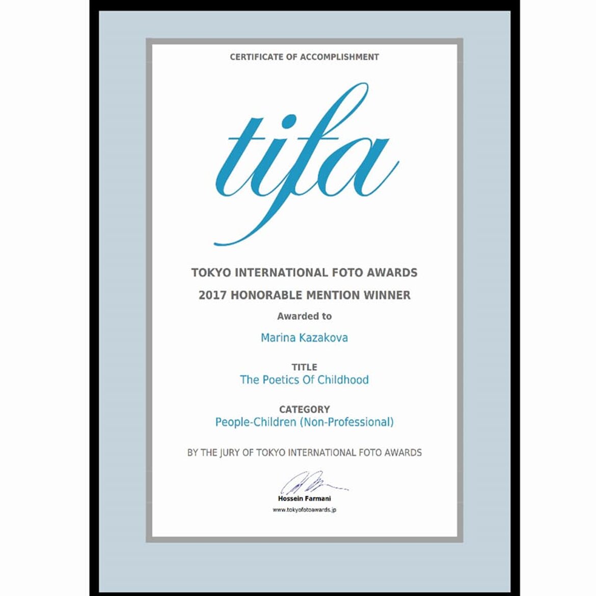 2nd place (portrait children category), 2nd place (fine-art category) Honorable Mention (portrait children category) Tokyo International Foto Awards TIFA 2017;